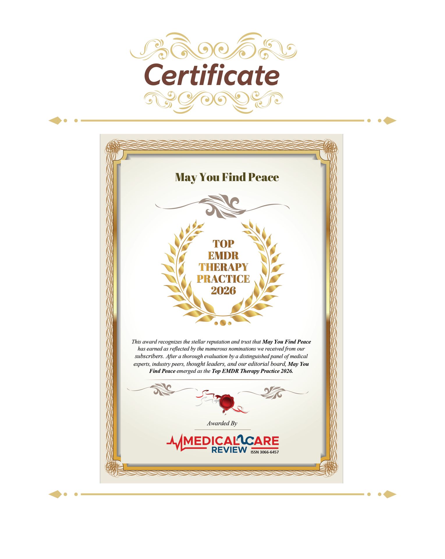 May You Find Peace has been recognised by Medical Care Review as a Top EMDR Therapy Practice of 2026. The award went through a proper evaluation process, reviewed by a panel of medical experts, industry peers, and an editorial board, and it started with nominations from our own clients and community.